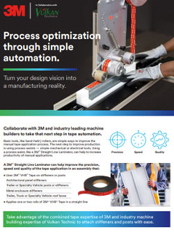 Take production up a notch with the 3M Straight Line Laminator, engineered to maximize efficiency and productivity. Straightforward and easy-to use, the Straight Line Laminator is a “process assist,” designed to increase productivity and elevate manual application efficiency when used alongside hands-on techniques. Designed for use with 3M VHB Tape, the 3M Straight Line Laminator system works through the help of human operators who feed straight parts through a dispenser, carefully applying pressure as the laminator smoothly applies the tape to provide a quick and user-friendly solution for attaching stiffeners and posts to panels in various applications. Featuring robust, acrylic adhesive to deliver instant strength and a durable bond, 3M VHB tapes are engineered to improve the overall aesthetics of the finished product by eliminating the need for rivets, screws, and weld distortion. Applications include stiffener applications for panels, specialty vehicles, metal enclosures and more.