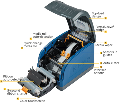 Foolproof drop-in label rolls and ribbons snap into place for 20-second material changeovers.