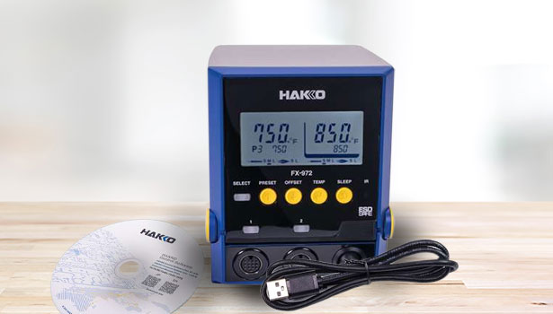 The FX-972 is compatible with the latest version of Hakko Control Software and features a sizable LCD display, an improved user interface, wireless IR temperature offsets, and more.
