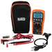 - Comes with test leads, receptacle test cord, instructions, batteries, and storage pouch